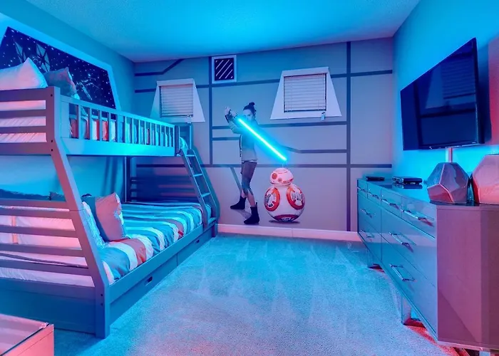 Gelegen in einer Entfernung von 7 km vom Blizzard Beach, bietet die 5-Zimmer- Sleek 5 Bdrm Home With Fun Themed Bedroom At Encore Orlando Zugang zu einem Swimmingpool.